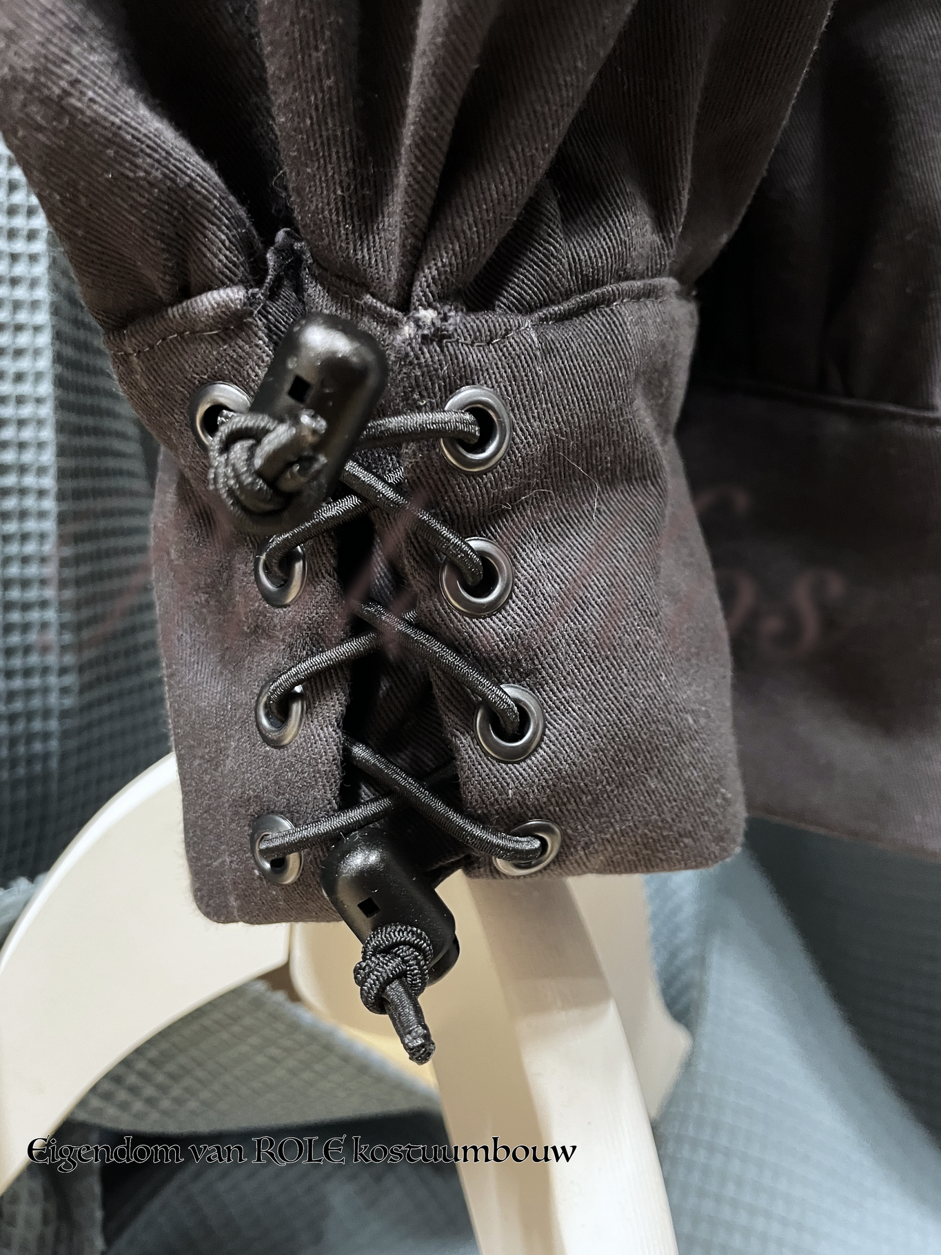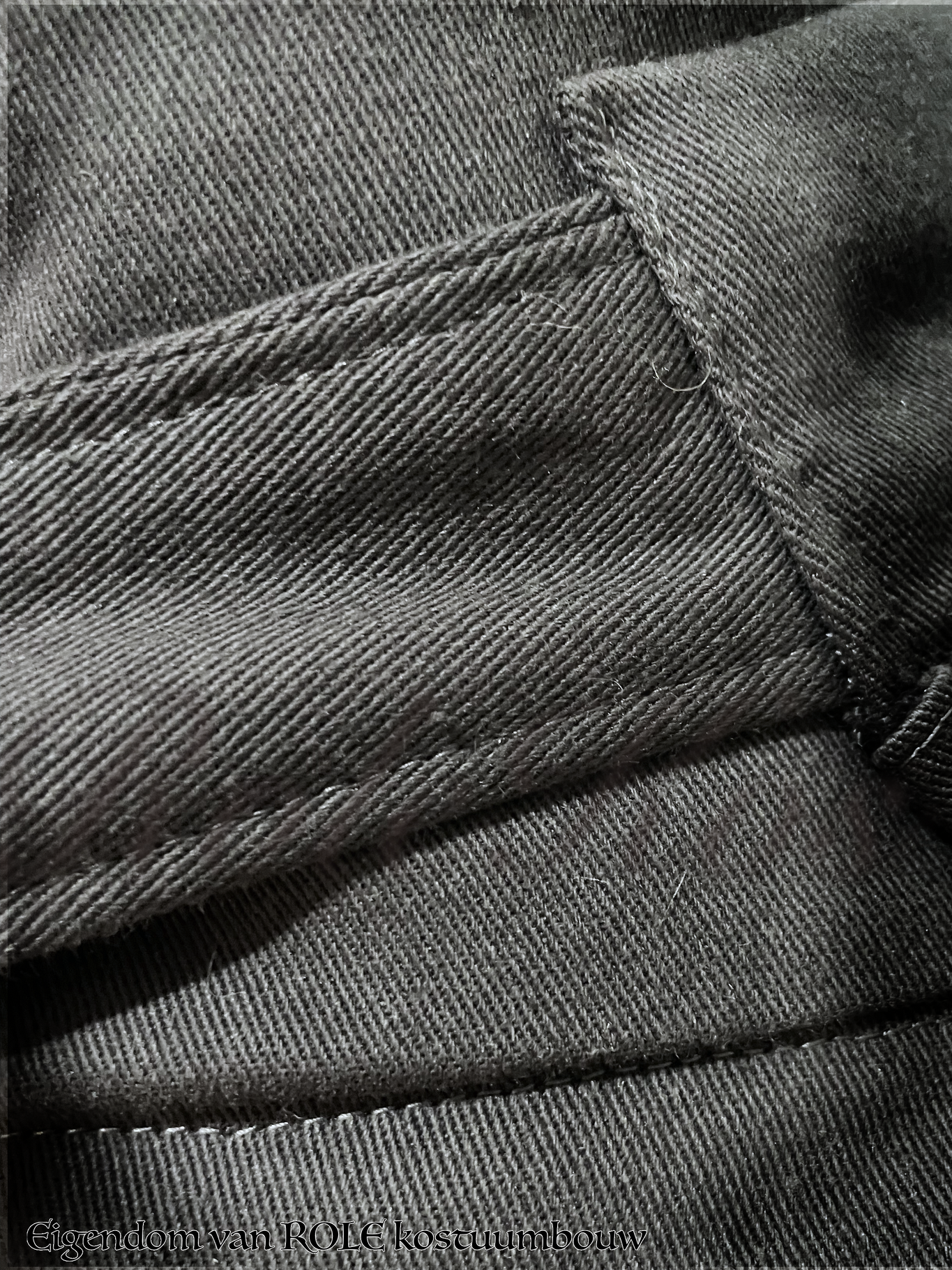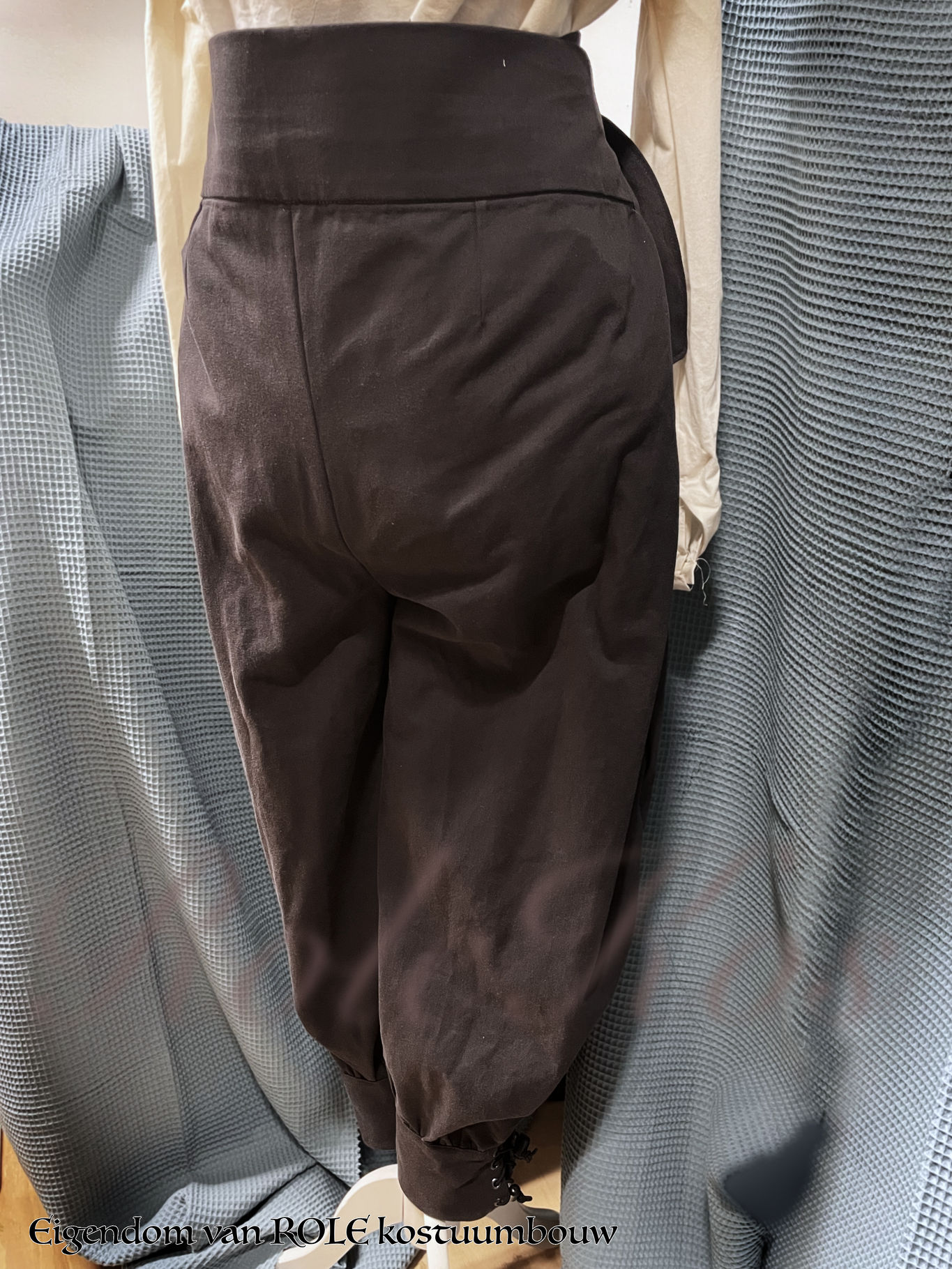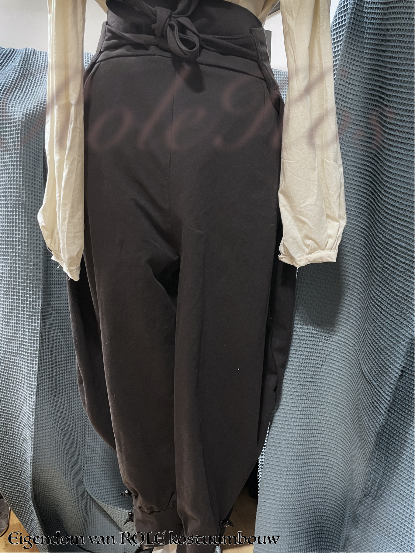Een gentleman's harembroek gemaakt van antraciet keperkatoen. Het doel is dat de broek 20 jaar mee kan. Om die reden is er een keuze gemaakt voor een lacing systeem aan de onderkant met elastiek afgewerkt. Het elastiek is gemakkelijk te vervangen als het op is, maar de voordelen van het materiaal zijn nog steeds te gebruiken.