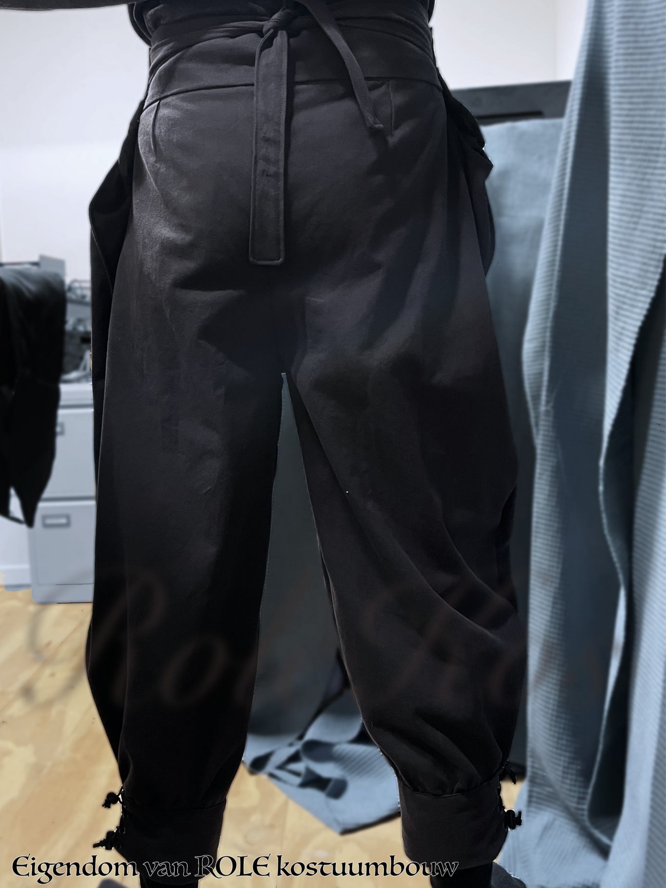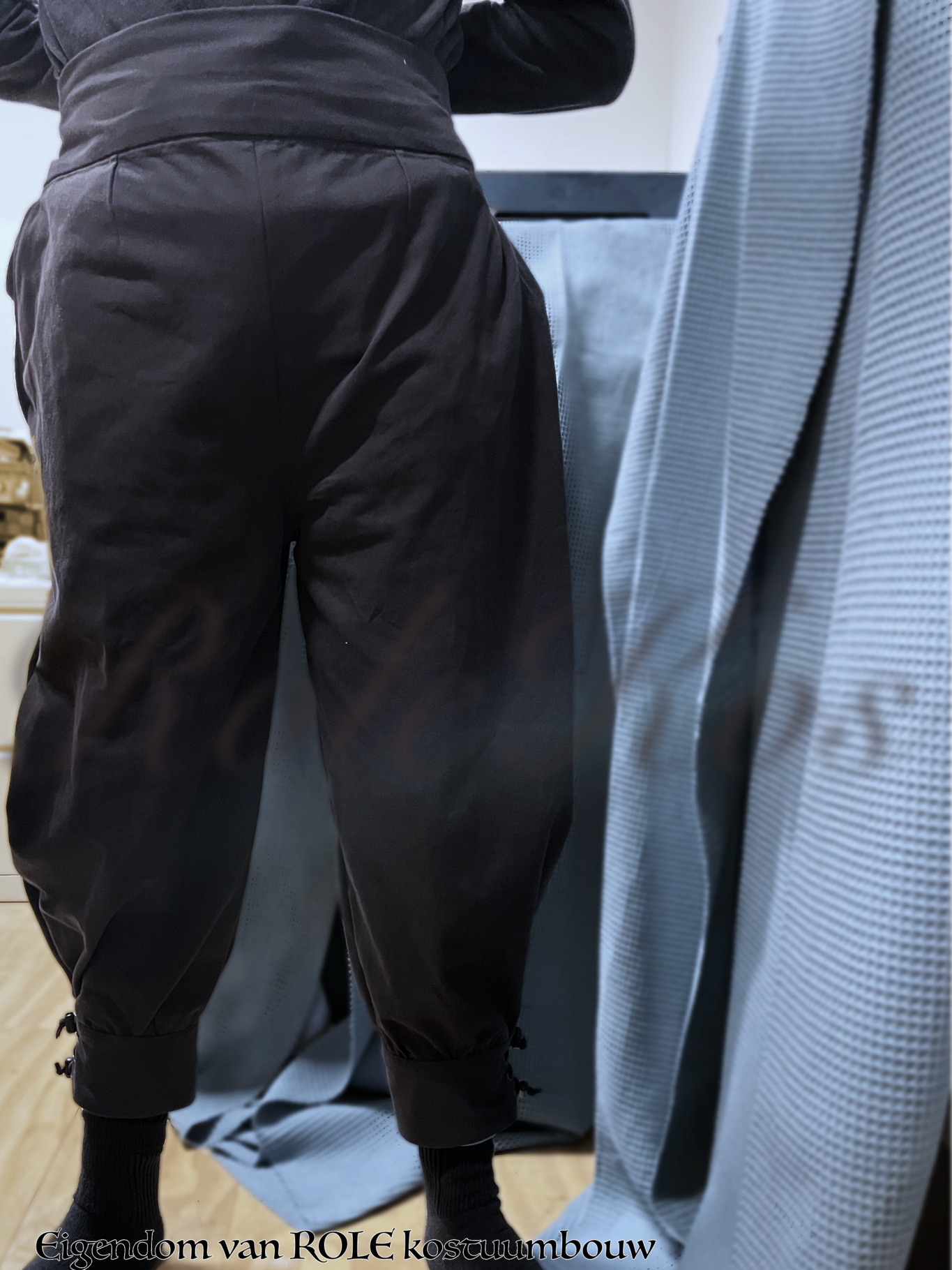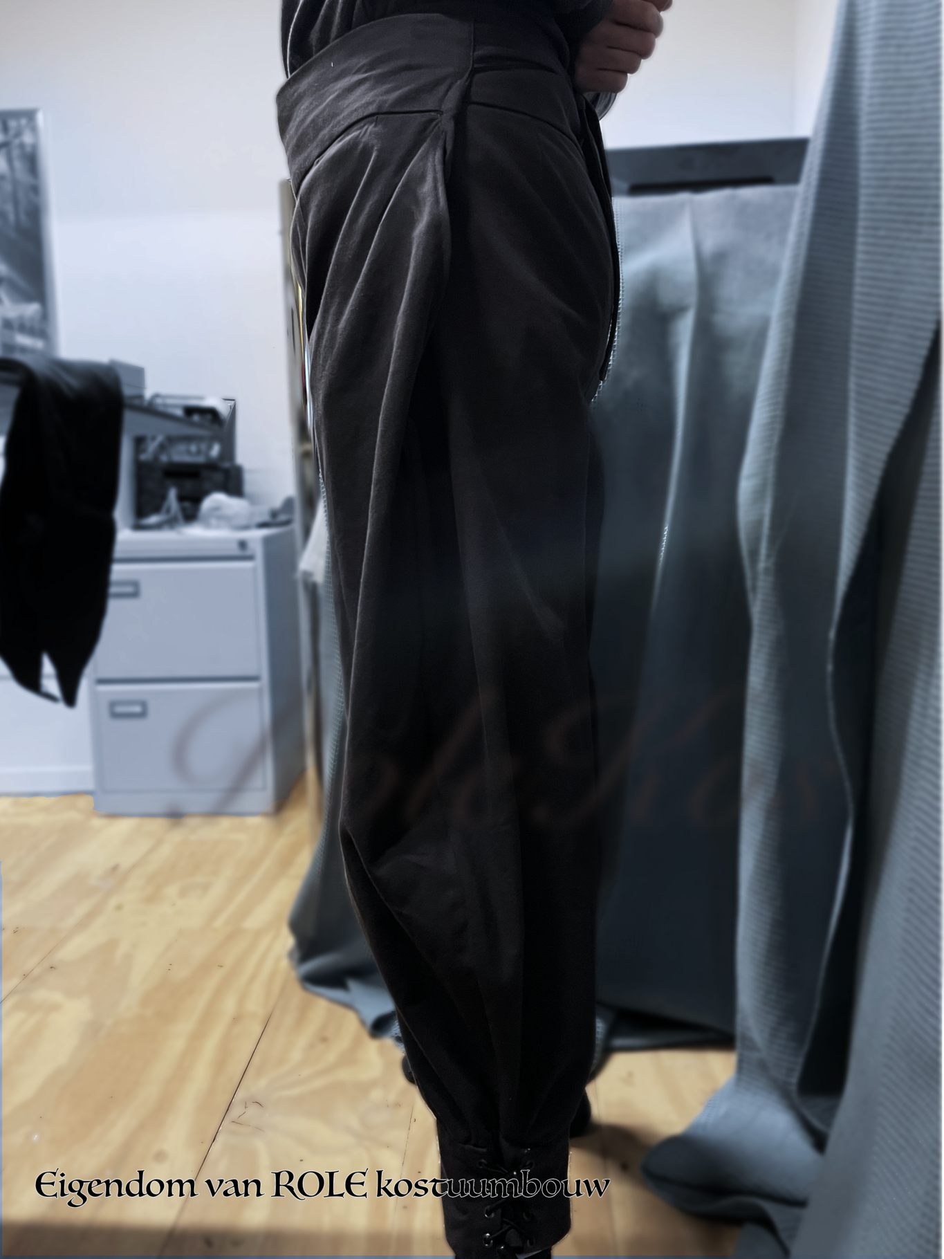 Een gentleman's harembroek gemaakt van antraciet keperkatoen. Het doel is dat de broek 20 jaar mee kan. Om die reden is er een keuze gemaakt voor een lacing systeem aan de onderkant met elastiek afgewerkt. Het elastiek is gemakkelijk te vervangen als het op is, maar de voordelen van het materiaal zijn nog steeds te gebruiken.